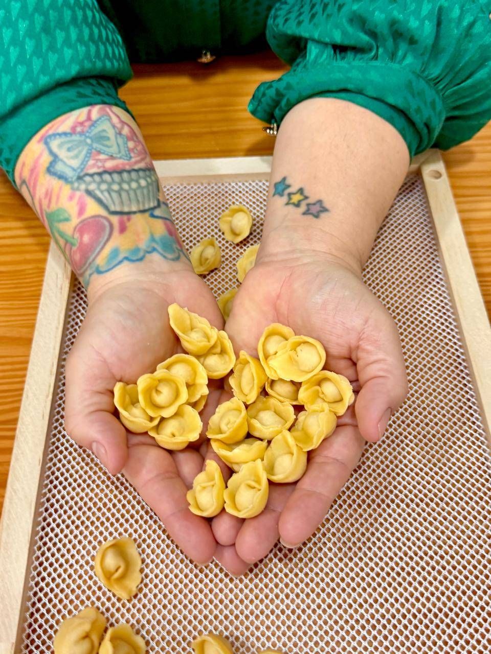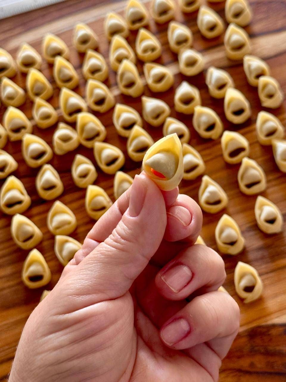 Laminação e espessura ideal da pasta para fazer lindos Tortellinis. Modelagem da massa recheada com carne cozida delicadamente..